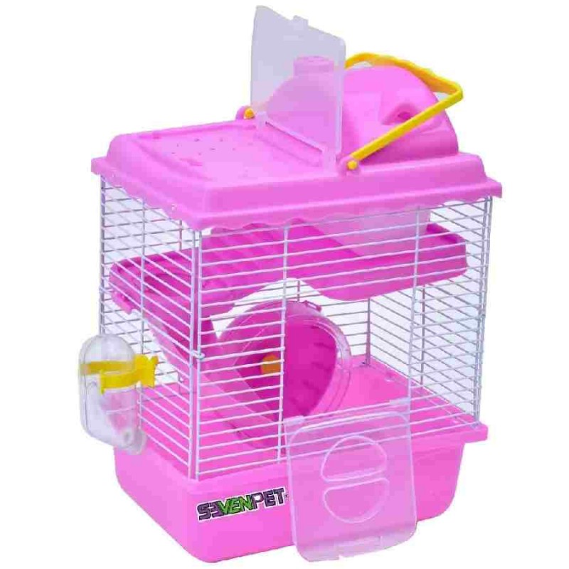 Jaula hámster minitoMedidas: 23 x 17 x 28 cm (largo x ancho x alto)Incluye:CasaRueda 11cmResvaladillaTazon para alimentoPlataformaAsa de sujetaciónBebedero 60 mlVentana plasticaColores: azul, rosa, cafe (sujetos a disporibilidad)